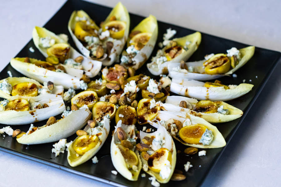 The combination of flavors in this appetizer is delectable. The bitterness of the endive mixed with the creamy blue cheese, sweet fig, and balsamic vinegar, plus the crunch of the pistachios, make my mouth water while writing this.
