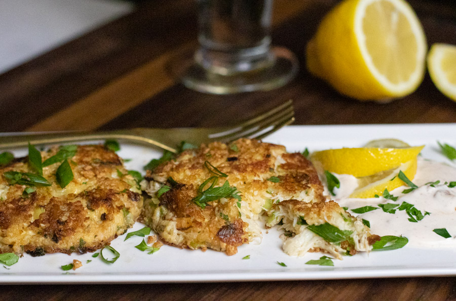 I like to serve the crab cakes with a fresh Cesar salad on the side and pair it with a glass of champagne or a dry Chardonnay.