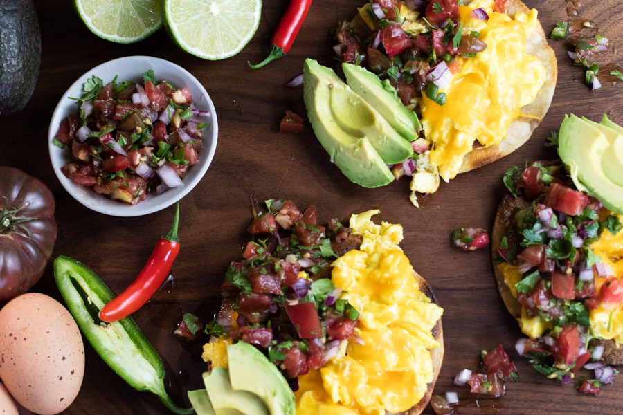 Arrange the tostadas on a plate, top with eggs, salsa, and avocado, and serve right away.