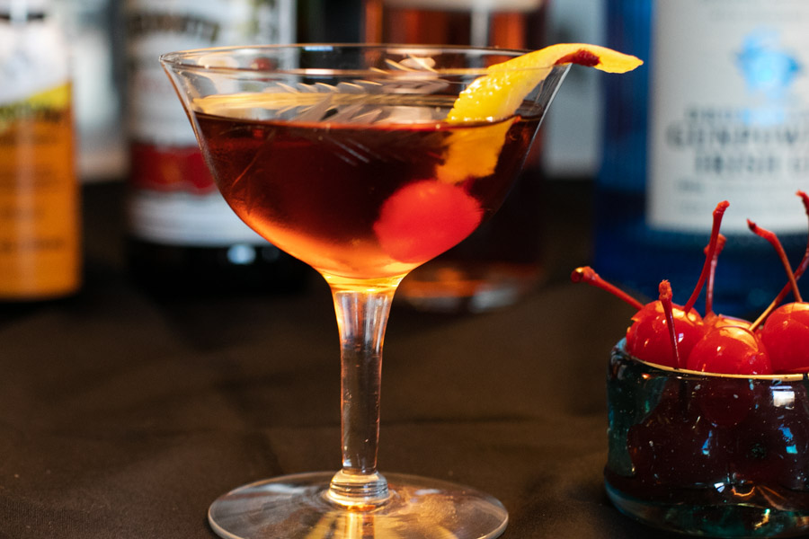 Add all the ingredients into a shaker with ice. Stir and pour into a glass. Garnish with lemon zest and a cherry.
