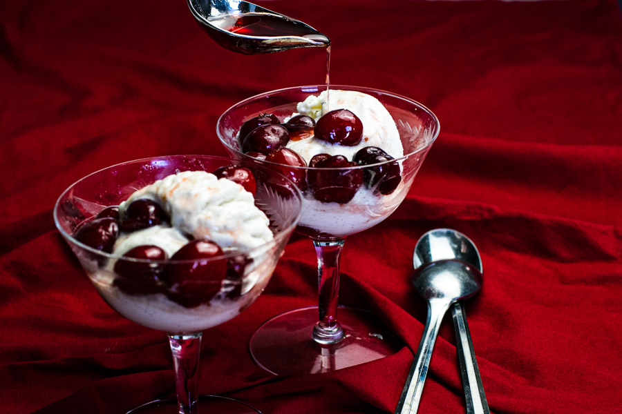Allow the fire to burn out by itself, approximately 2-3 minutes. Scoop the vanilla ice cream into two bowls and top with the cherry mixture. Serve immediately.
