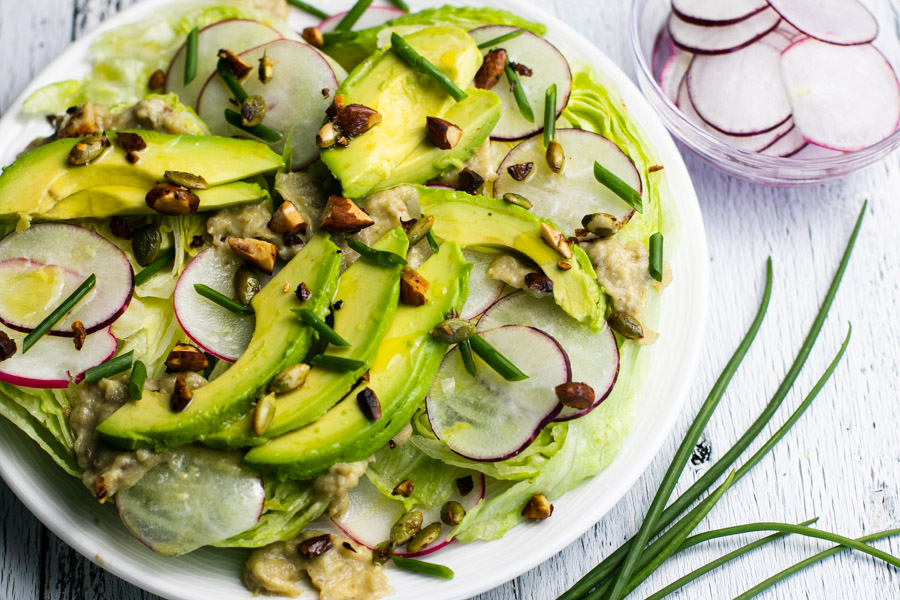To assemble the salad, place the lettuce wedges on a large platter or four individual plates. Lightly drizzle olive oil over the lettuce and season with salt and pepper. Spoon the dressing over the lettuce. Next, add the radishes and avocado slices. Top with the chives, the crisp topping, and another slight drizzle of olive oil. Serve immediately.