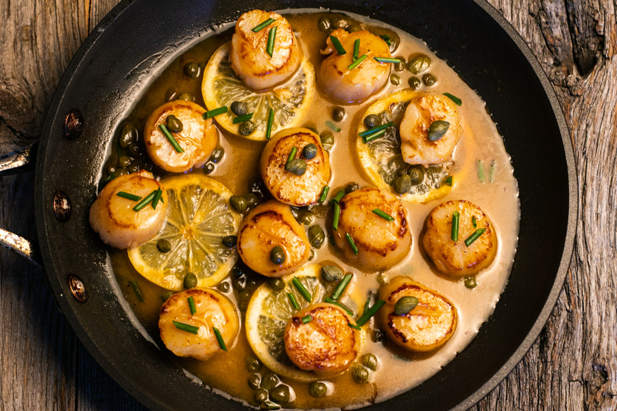 Continuing on medium-high heat, add the butter. Stir in the sherry to deglaze the pan. Add the lemon juice, capers, and lemon slices to the skillet and continue simmering until the sauce has thickened just a bit. Lastly, add the scallops to the sauce.
