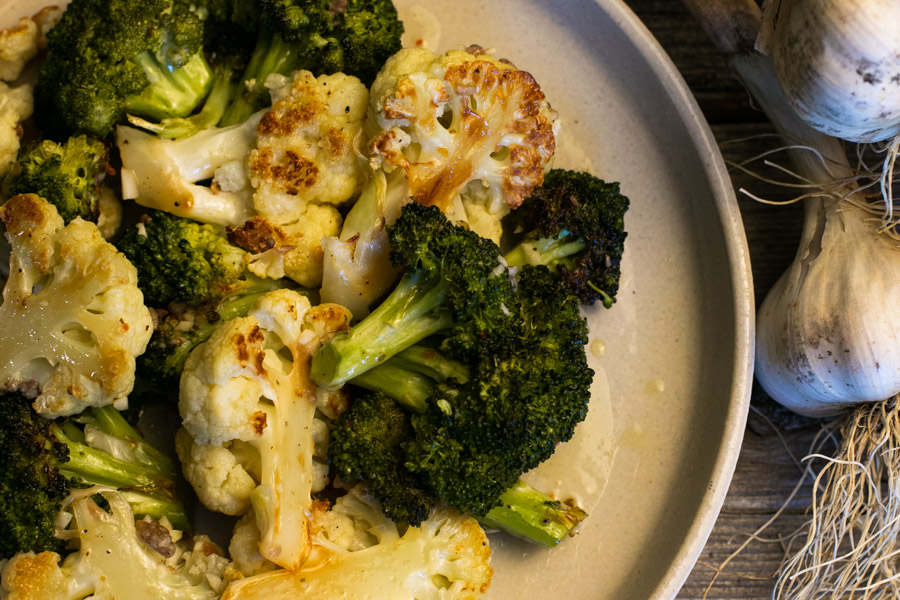 Toss broccoli and cauliflower with a drizzle of olive oil and season with salt and pepper.