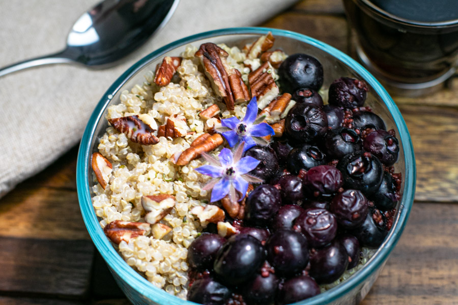 In four small bowls divide up the ingredients by adding the cooked quinoa, sprinkle of hemp seeds, and top with almonds, a drizzle of macadamia nut milk, and a few spoonfuls of blueberry sauce. Drizzle with maple syrup if you want it a little sweeter.