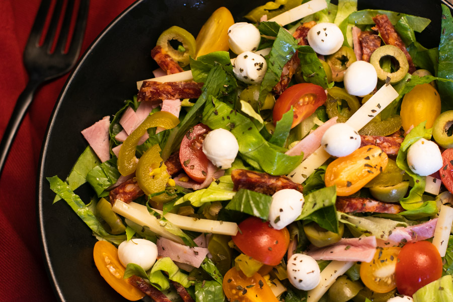 You can increase or decrease the meats and cheese to your liking. And you can add croutons to make it more like a chopped-up Italian Hero Sandwich.