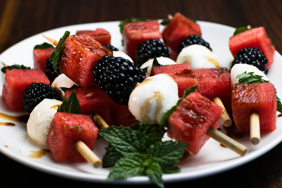 For each skewer, start with a piece of watermelon, then mint, mozzarella, blackberry, watermelon, and mint.