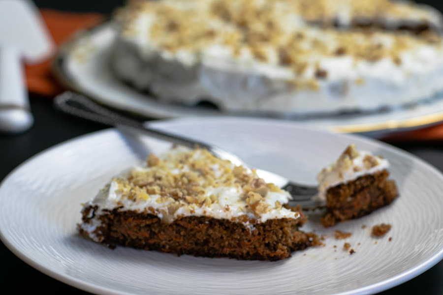 Fold in the carrots and pour the batter into the cake pan. Bake for 40 minutes or until a toothpick comes out with a few crumbs. Let cool completely. Remove the cake from the pan onto a cake plate.