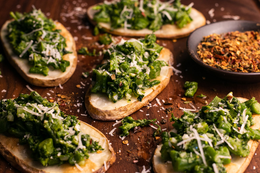 Scoop the bruschetta onto the baked potato slices and top them with parmesan cheese.