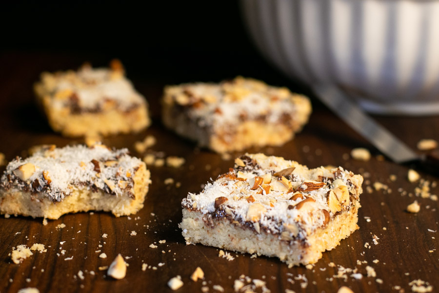 These bars are gluten-free and absolutely divine. The almond flour crust topped with chocolate, almonds, and coconut makes for a delicious sweet treat.