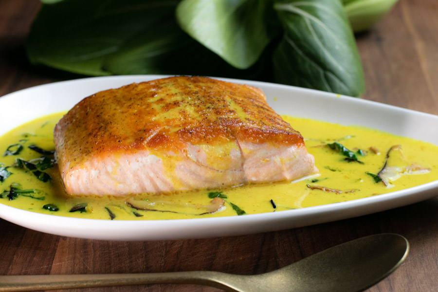 While sautéing the salmon, make the curry by adding the coconut milk, garlic, coriander, curry powder, curry paste, red pepper flakes, syrup, mushrooms, bok choy, and broth to a skillet on medium heat. Simmer the curry until it begins to thicken up. Approximately 10 minutes. Add the lime juice and season with salt and pepper taste.