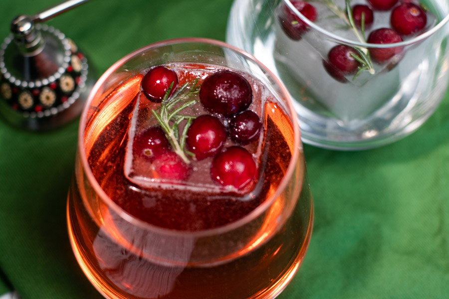 This is a fun cocktail for the holidays. The beautiful ice cubes set the tone for an enjoyable evening with family and friends sipping boozy drinks.
