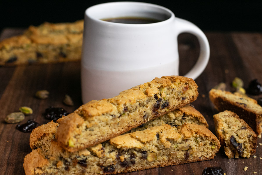 Slice the loaves into ½ -inch biscotti and place them on the lined baking sheet. Bake the biscotti for 10 minutes, turn them over and continue baking for another 10 minutes. The biscotti should be golden brown.